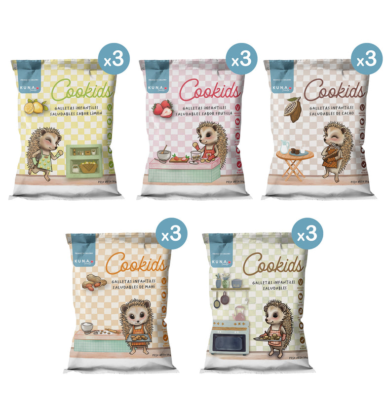 Disfruta los 5 sabores favoritos en un solo pack: cookids original, frutilla, cacao, maní y limón 🍪.