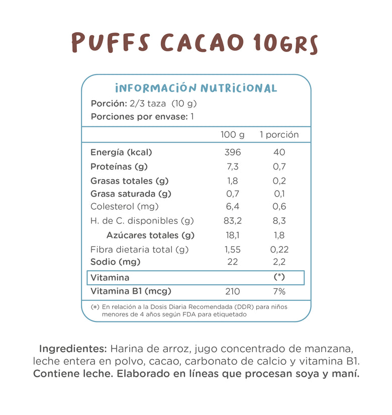 Rica y nutritiva colación elaborada con harina de arroz, jugo concentrado de manzana, cacao y leche en polvo, pensada para bebés y niños desde los 12 meses.